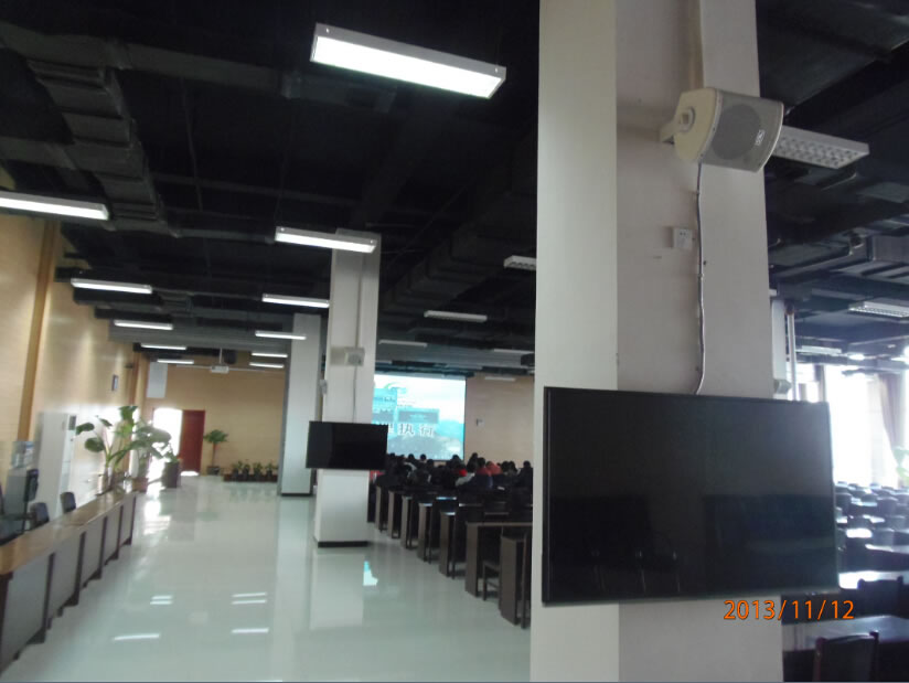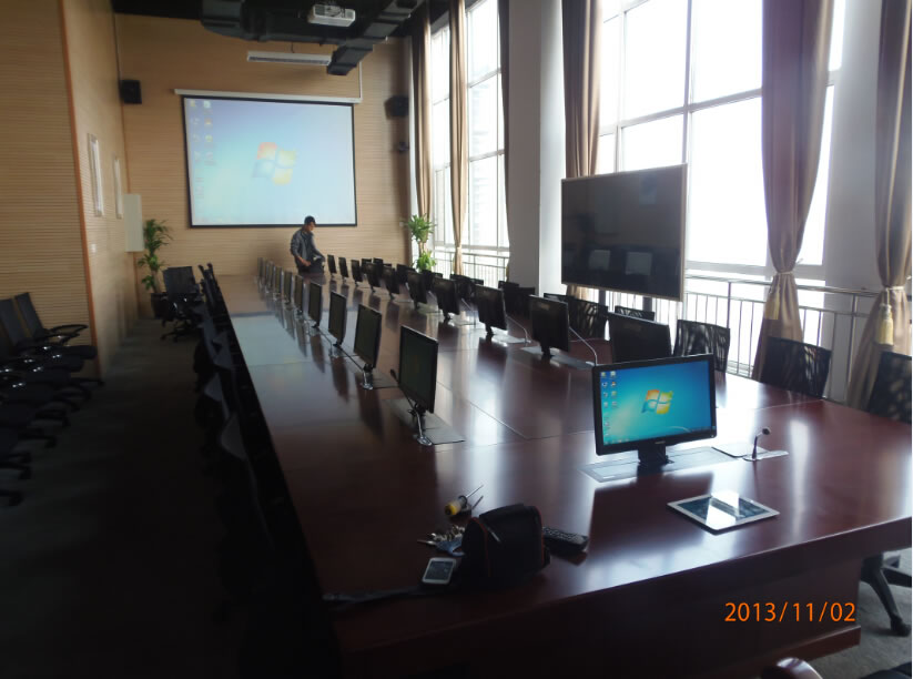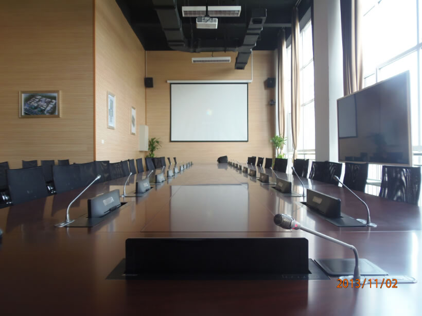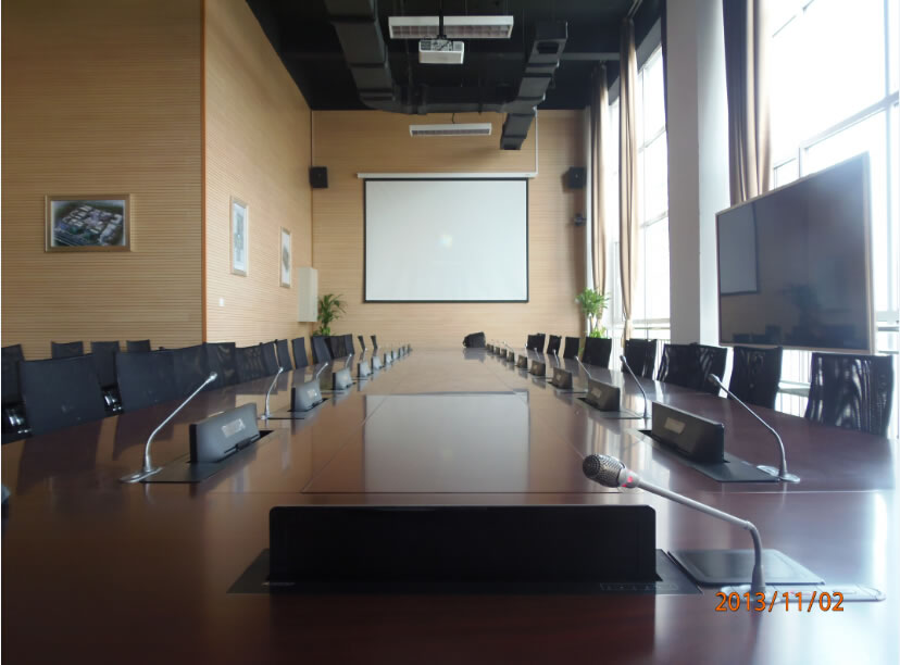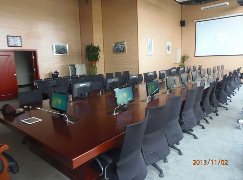 河北天山集團長江道一號培訓室及高管會議室遠程音視頻系統:培訓室擴聲部分采用主擴聲Soundking(音王)G05線性陣列音響、補聲及返聽音響采用Soundking(音王)FT8同軸音響、話筒采用mcmyk (美鐳)MC9160攝像跟蹤手拉手話筒、視頻顯示部分選用panasonic(松下)PT-SLX12KC投影機 亮度:13000流明、美視300寸正投遙控電動幕布、兩側選用三菱LX-7950投影機 亮度:6000流明、美視200寸電動遙控幕布、中央控制系統選用CREATOR(快捷) CR-PGMⅢ可編程中控系統、遠程會議系統采用網動高清遠程MCU及高清視頻終端主機等。